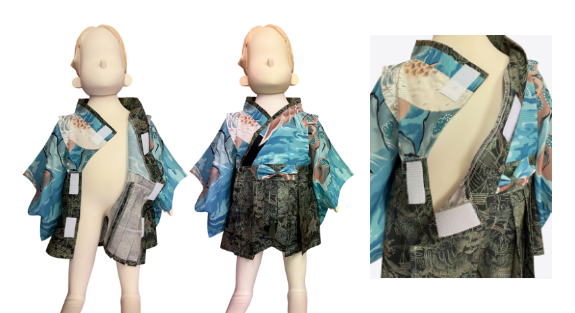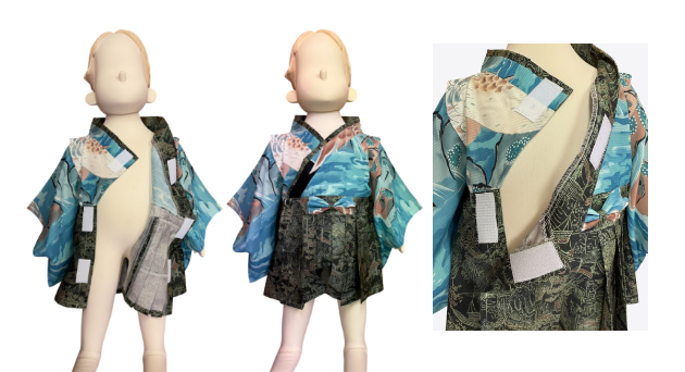 寄付でいただいた着物や、大人用の着物は一度生地に戻しリメイクしています。ベッドの上でも、できるだけ少ないサポートで着られるよう、細部にまで工夫を施しています。