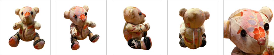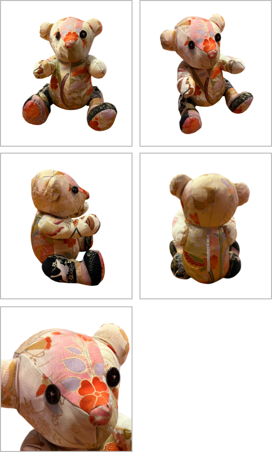 このぬいぐるみの製作コンセプトは、アンティークの着物や帯を製品に加工する際、どうしても生まれる残布を活用し、無駄なく使うサステナブルな取り組みから生まれました。さらに、その中材(残布)の詰めなどの工程を B型事業所の皆さまへ適正価格で依頼することで、新たな仕事の創出につなげています。